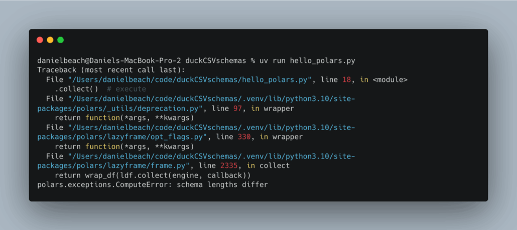 It’s not a surprise that Polars, in all its Rust-based exactness and perfection, chose to puke. But what about DuckDB? DuckDB seems to be a tool built and grounded in the concepts of real-life dirty Data Engineering, doesn’t it?